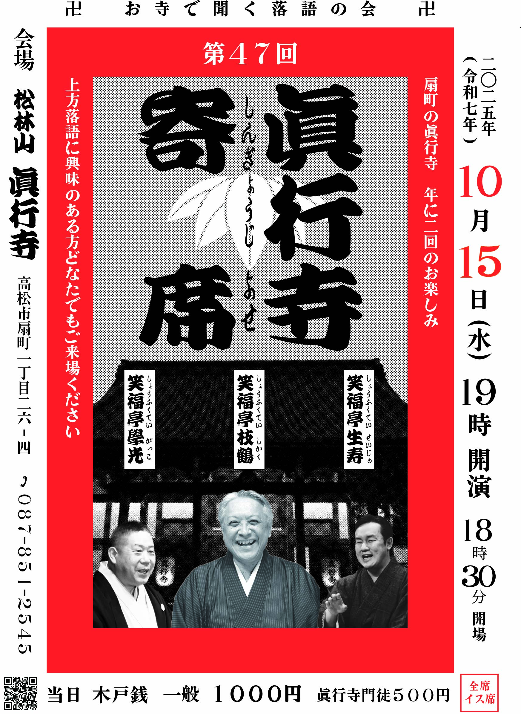 2025年10月15日(水) 19:00開演(18:30開場・受付開始) 木戸銭:1,000円(真行寺門徒 500円) 出演:笑福亭 枝鶴 / 笑福亭 學光 / 笑福亭 生寿 会場:真行寺 眞行寺寄席のページへ