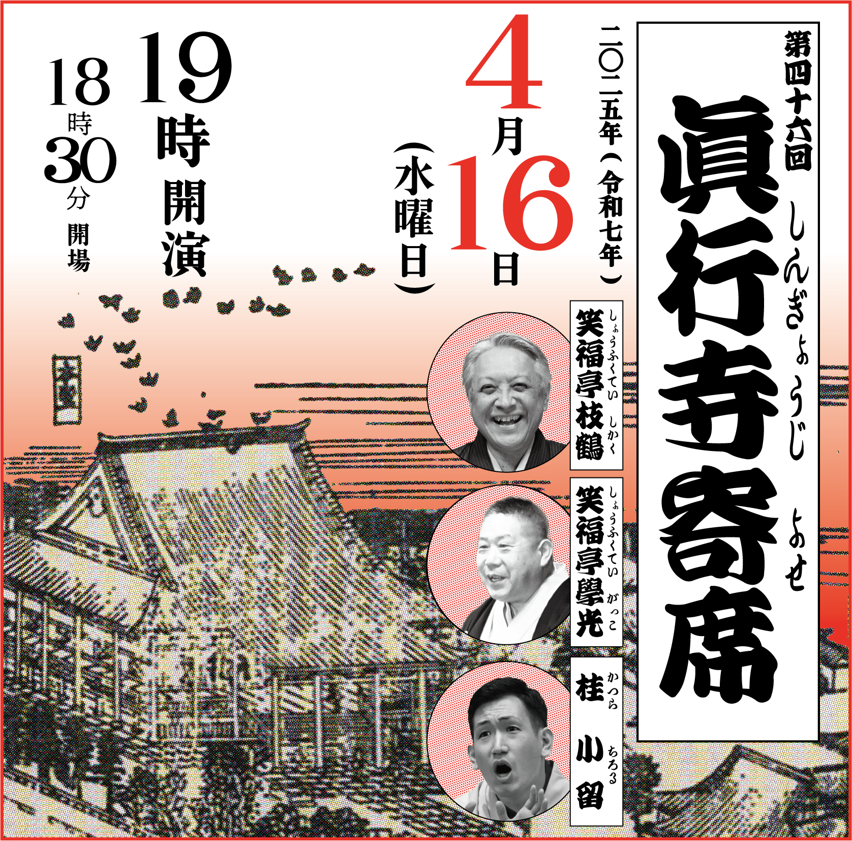 2025年4月16日(水) 19:00開演(18:30開場・受付開始) 木戸銭:1,000円(真行寺門徒 500円) 出演:笑福亭 枝鶴 / 笑福亭 學光 / 桂 小留 会場:真行寺 眞行寺寄席のページへ